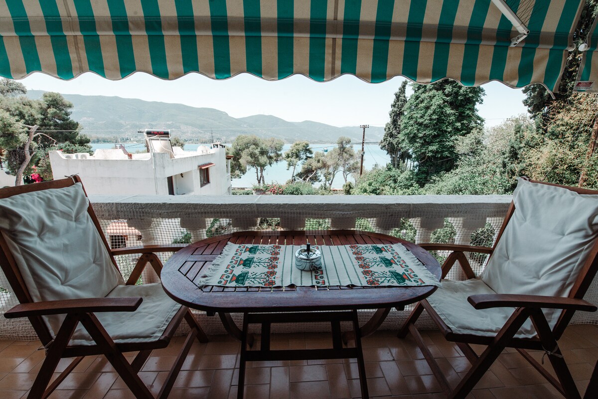 Apartmen selesa dan unik terletak di atas bukit hijau. Balkoni ini luas dengan pemandangan laut panorama dan Teluk Saronic.