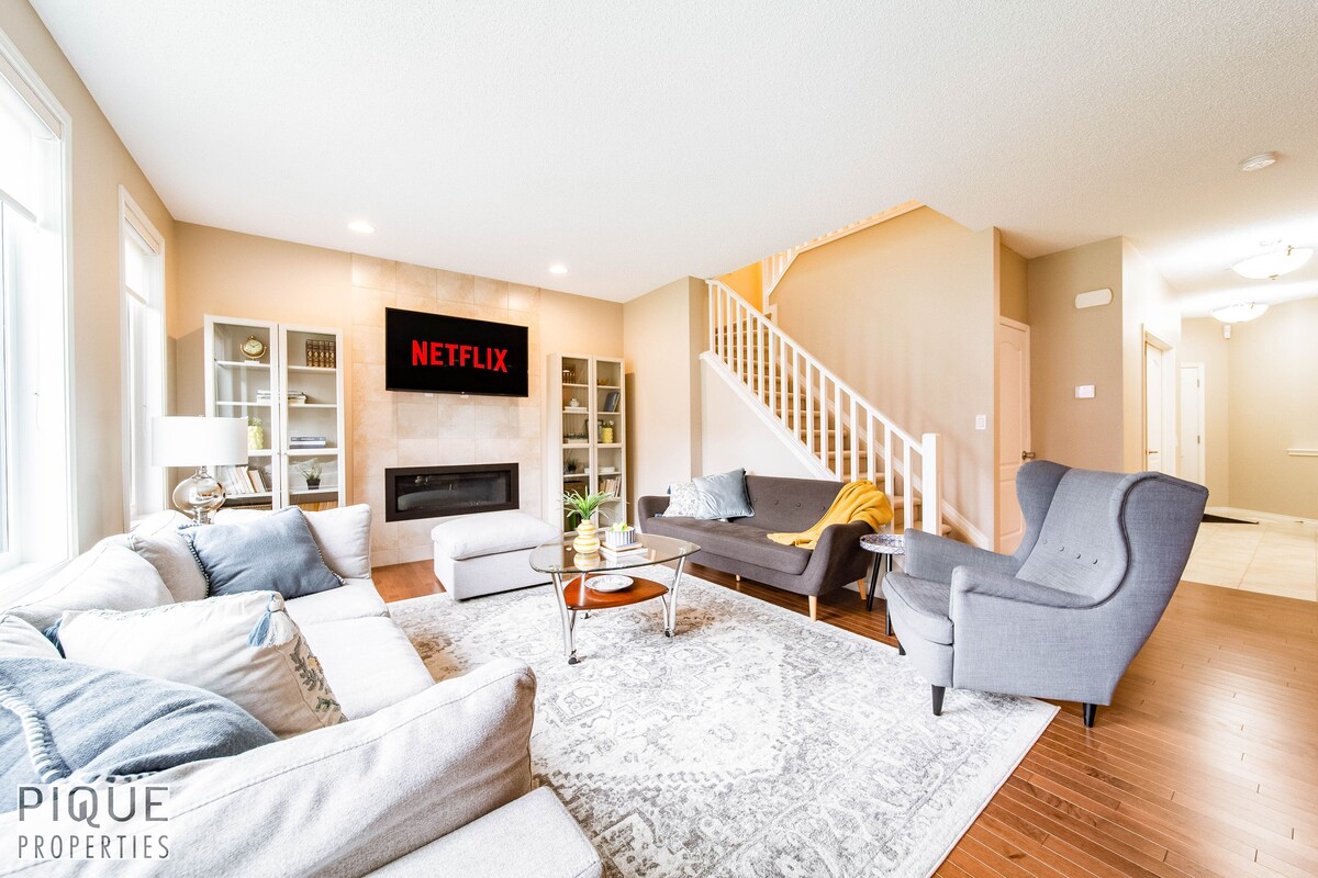 Bersantai dan berehat di ruang baru yang tenang dan bergaya ini dengan pemandangan kolam. Sama ada anda ingin mengerekot di tepi pendiangan, bermain kolam renang, dart atau bersenam, tempat kami ada semuanya! Anda juga boleh menikmati pemandangan kolam yang indah dari dalam atau luar di patio. Pada waktu petang, nikmati duduk di tepi api yang hangat untuk mengakhiri hari. Kami berhampiran dengan banyak kemudahan tempatan, 8 minit ke WEM, 3 minit ke River Cree Casino, 15 minit ke pusat bandar. Kami ingin menjemput anda untuk menginap di sini. Tempah penginapan anda dengan kami hari ini!