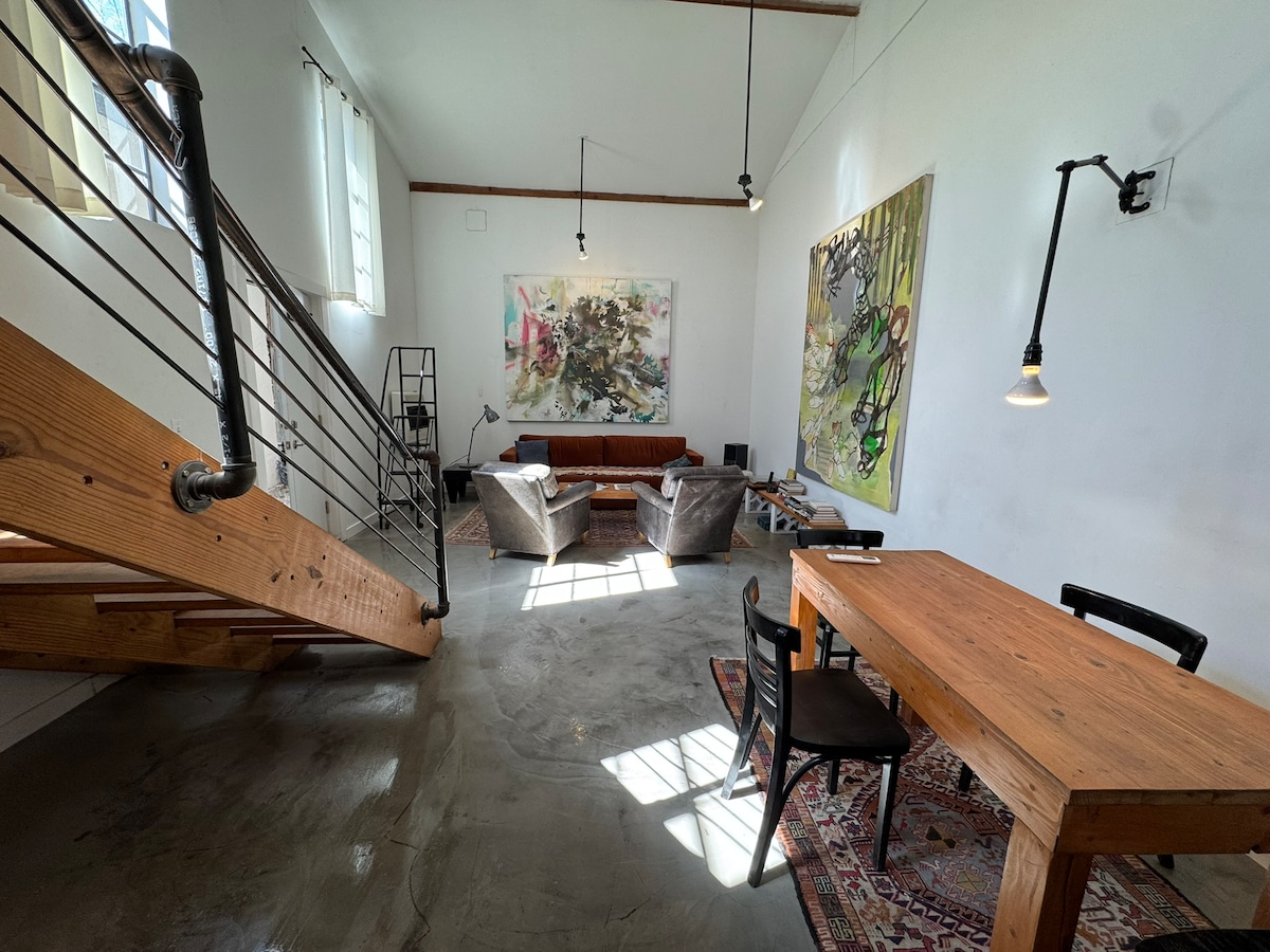 Kediaman di bekas studio seni di ladang ternak seluas 8 ekar yang dikongsi di jalan tanah di tepi barat bandar, bertentangan dengan kawasan terbuka sepanjang berbatu-batu. Loteng ini adalah 750 kaki persegi ruang terbuka siling tinggi dengan 600 kaki persegi beranda tertutup di bangunan persendirian.