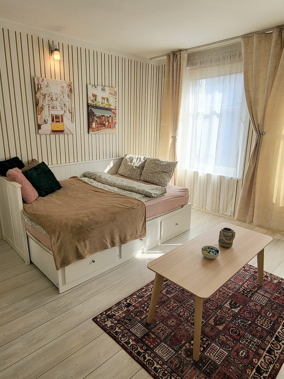 Studio gaya retro mesra alam yang selesa di kawasan yang damai, salah satu kawasan yang paling bergaya di Tallinn, berhampiran dengan Telliskivi Creative Center. NB! Masa daftar keluar adalah 12.00. Masa daftar masuk ialah 15.00 - 19.00 NB! Semasa Cuti Kebangsaan sila sahkan masa daftar masuk terlebih dahulu. Jika anda ingin mendaftar masuk lebih awal atau lebih lewat daripada masa itu, kemudian tulis kepada saya, kita boleh lihat jika ada apa-apa yang boleh dilakukan. Anda boleh mengambil kunci dari tempat saya atau hos bersama. Daftar masuk selepas pukul 23.00. Anda perlu mengesahkannya sebelum membuat tempahan 🙏