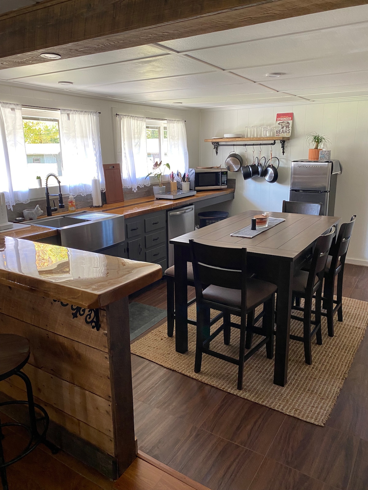 Kabin sangat menawan, tetapi ketinggalan zaman. Dapur mempunyai peti sejuk bersaiz besar, ketuhar gelombang mikro, ketuhar pembakar roti, plat panas, pembakar roti + keurig. Kopi, perasa, sabun & syampu disediakan. Terdapat pemanggang gas. Tetamu menyediakan cadar, tuala, kayu unggun & air minuman mereka sendiri. Pelbagai dvd & permainan, air panas di dalam & di luar pancuran mandi & tab mandi. Tiub untuk terapung disediakan, berenang risiko anda sendiri. Lubang api, anak sungai disediakan. Langkah ke dek menghadap anak sungai.Trash pulang ke rumah dengan tetamu, merokok di atas dek sahaja.