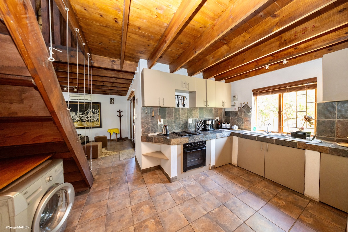 Lupakan kebimbangan anda di ruang yang luas dan tenang ini. Maksimum 6 orang dewasa. Mesra anjing, atas permintaan. Maksimum 2 ekor anjing. Loji tenaga hijau, rumah tumpangan dengan kemudahan masak-memasak sendiri, terletak di antara Pergunungan Drakensburg dan sungai Olifants. Sebuah rizab berpagar seluas 1000 hektar dengan keselamatan 24 jam, di mana seseorang boleh memandu dan berjalan dengan selamat, menikmati permata tersembunyi yang menakjubkan ini Kami terletak 35 minit dari Hoedspruit dan sejam dari Kruger dan Manyeletti; Tempat yang sempurna untuk mengakses aktiviti tempatan dan pelbagai kemudahan.