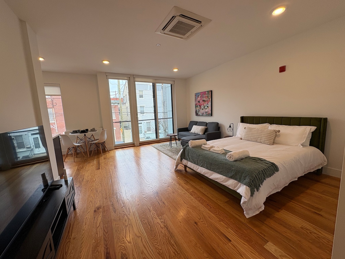 Selamat datang ke Velvet Loft. Apartmen 1 bilik tidur yang anggun dan moden ini menggabungkan keselesaan dan gaya. Nikmati kemudahan terbaik kami: berehat di dek bumbung dengan pemandangan bandar yang menakjubkan, berseronok di bilik permainan dengan meja kolam renang dan banyak lagi, dan kekal aktif di pusat kecergasan 24/7. Terletak di kejiranan Brewerytown yang meriah, anda hanya beberapa langkah dari kedai makan yang bergaya, kafe yang selesa, taman yang indah, dan pengangkutan awam yang mudah. Tempah penginapan anda yang tidak dapat dilupakan di Philadelphia hari ini!
