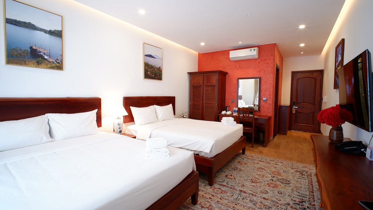 Welcome to Vesta Boutique Hotel – your stylish getaway in the heart of Phu Quoc! This modern room features 2 beds, perfect for friends or small families seeking both comfort, cozy and convenience. One of the highlights of your stay is the rooftop, where you can enjoy sweeping island views, fresh sea breezes, and stunning sunsets + firework show – the perfect way to start or end your day and end the day.