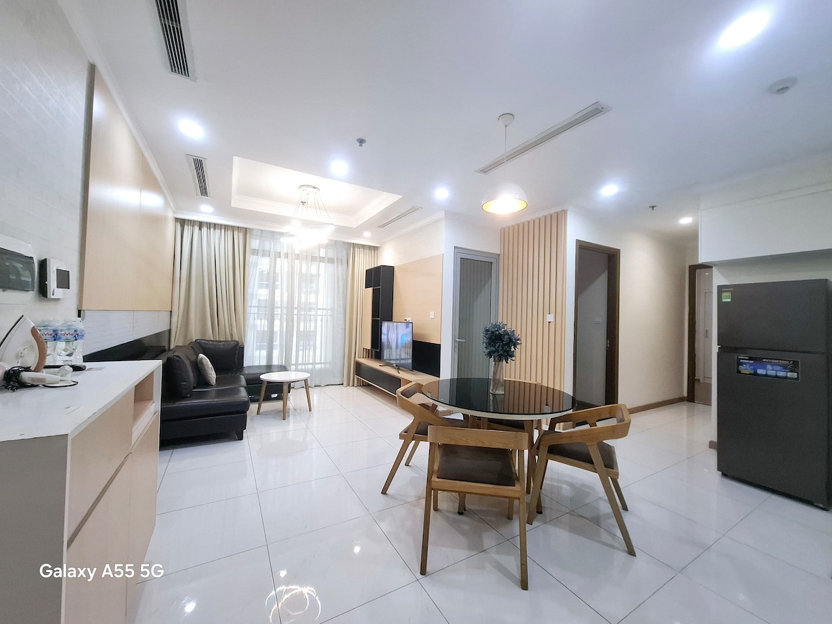 Apartmen sudut, dilengkapi dengan banyak peranti pintar seperti langsir, Penyaman udara, TV.. terletak di bangunan apartmen mewah The Manor 2, dengan kolam renang percuma di atas bumbung. Hanya 5 minit ke daerah pusat 1. Hanya 300 meter dari bangunan tertinggi Mercu Tanda 81 Vietnam bersebelahan Vinhomes Central Park. Bangunan ini terletak di jalan Nguyen Huu Canh, mudah untuk menempah teksi atau bas untuk pergi ke mana-mana. Utiliti seperti: Gimnasium, Restoran, Kafe semuanya terletak di dalam bangunan yang mudah untuk mengembara.