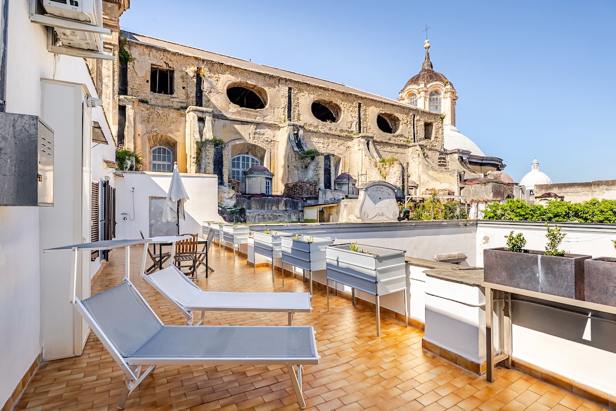 Terletak di pusat bandar, di tingkat atas bangunan bersejarah dengan penyaman udara dan WIFI. Flat ini mempunyai 2 bilik tidur dan 2 bilik mandi, katil sofa tambahan disediakan. Dapur ini lengkap dengan mesin basuh pinggan mangkuk, peti sejuk dan mesin basuh. Teres yang indah untuk menikmati pemandangan Vesuvius dan istana. Jarak berjalan kaki ke monumen yang paling penting, juga 2 stesen metro dan kereta kabel. Untuk sampai ke flat, naik lif ke tingkat 3, kemudian naik tangga!