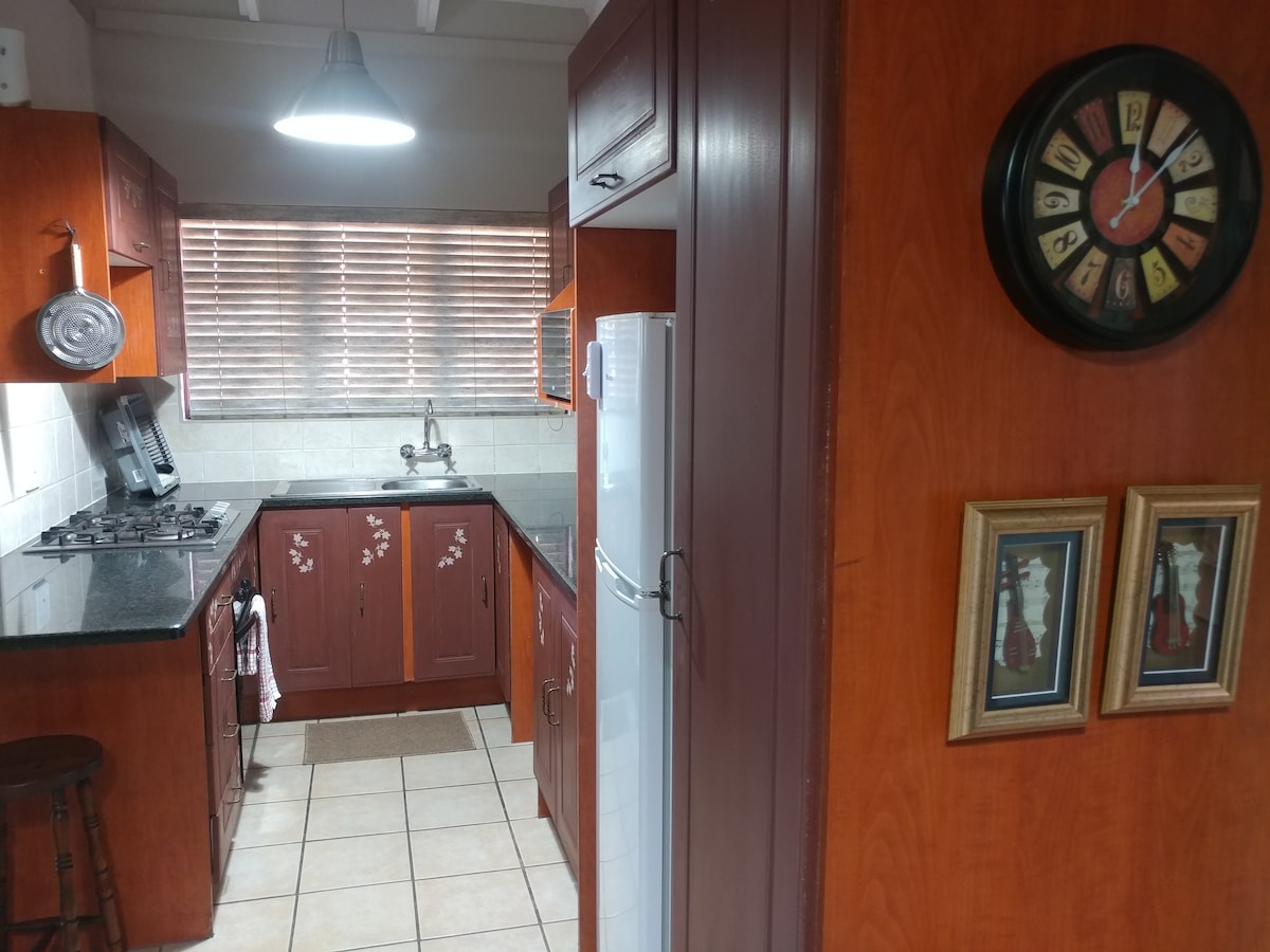Keanggunan dan kemudahan! Suite loteng 55 meter persegi baru yang cantik terletak di cul-de-sac yang tenang di estet golf 18 lubang. Nikmati ketenangan fikiran dengan keselamatan terbaik dan kuasa solar supaya anda tidak perlu bimbang tentang gangguan bekalan elektrik. Pintu masuk persendirian. Bersantai di katil bersaiz queen mewah, cadar kapas Mesir terbaik dan selimut dan bantal angsa mewah. Cerek, ketuhar gelombang mikro dan peti sejuk, nikmati kopi penapis berkualiti, teh dan rusks. TV skrin rata dengan pakej DSTV penuh dan wifi gentian.