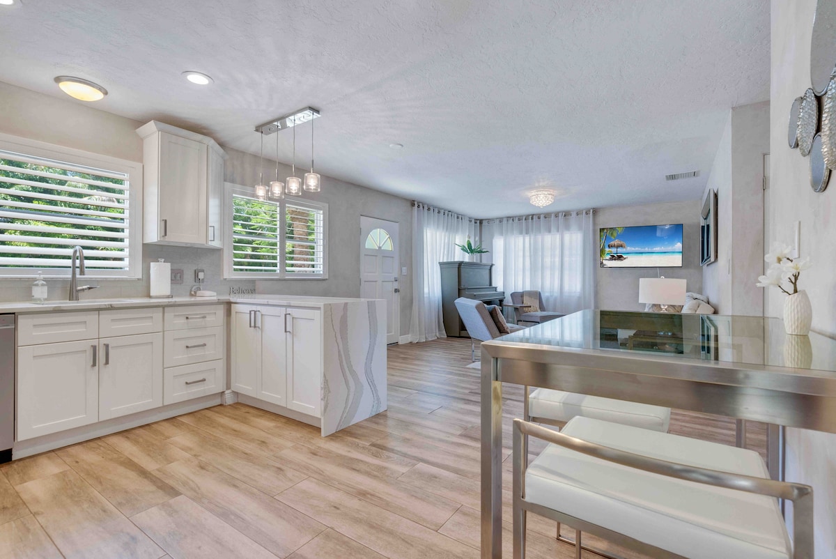 Di luar Pusat Bandar berhampiran Legacy Trail, rumah ini terletak di kejiranan yang tenang hanya 15 minit dari Siesta Key Beach. Penginapan ini menonjol dengan reka bentuknya yang cerah dan lapang, kolam air masin baharu di halaman belakang persendirian, dan ruang tamunya yang berangin. Pancuran hujan bilik mandi utama yang besar sesuai untuk mencuci pasir yang tinggal dari pantai. Anda juga boleh menghabiskan malam anda memanggang di belakang atau bermain corn hole di kawasan patio.