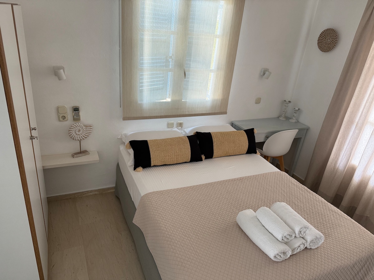 Only 3 minutes walk from Naoussa center and really close to the sea , this cozy and recently renovated house with 2 bedrooms, a kitchen and a bathroom, is a delightful alternative to the vast variety of Naoussa rentals. Fully-equipped and traditionally designed, Sofianna's house brings together a peaceful stay with the lively and cosmopolitan nightlife of Naoussa. The house comes also with a small veranda with a commanding view to both sea and town to savour your coffee and meals.