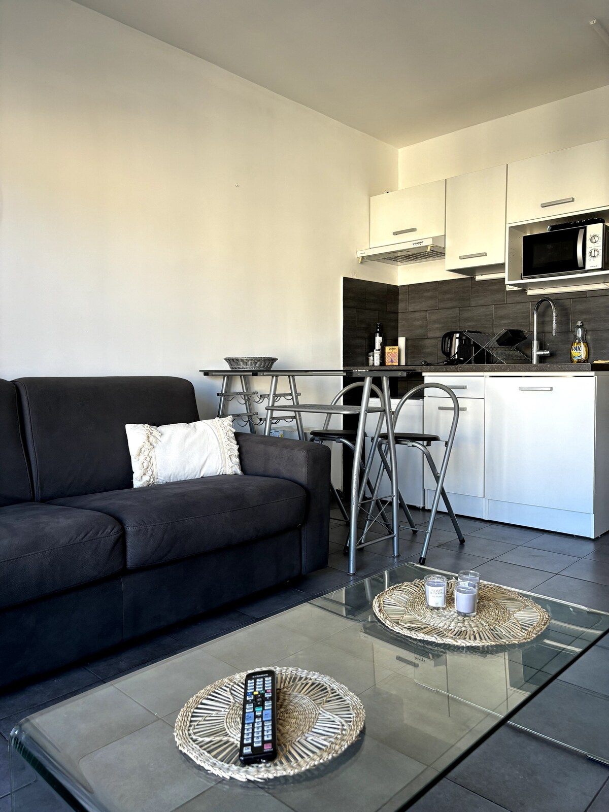 Studio yang diubahsuai dan berhawa dingin seluas 24 m2 di kediaman yang terletak 2 minit berjalan kaki ke laut. Dekat dengan semua kemudahan, anda akan menemui semua kedai yang diperlukan di kaki penginapan. SARAPAN Anda boleh menikmati sarapan setiap hari yang termasuk dalam harga yang akan dihidangkan kepada anda di kafe di kejiranan 300m dari penginapan di dataran pasar. Ini termasuk minuman panas, pastri, dan satu jus oren diperah setiap orang.