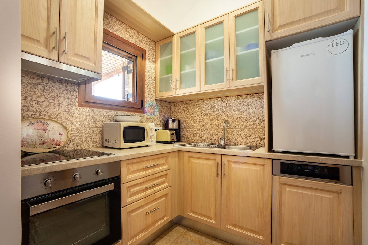 400 sqft (36 m²) Studio in second line to the sea (but only 15 meters from the waterline), integrated kitchen and separate bathroom, large double bed and extra sofa bed, sea view (partially obstructed), 2 private gazebos and a private sunbathing terrace directly above the sea with unobstructed sea view and shower. Newly renovated 2022 with new kitchen new appliances etc. Free fast WiFi. Convenient private parking is available just behind the cottages.