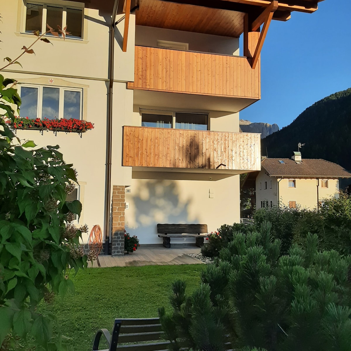 Helle Zweizimmerwohnung mit wunderschöner Aussicht auf den imposanten Langkofel, die Sellagruppe und die Cirspitzen, in sonniger Lage, abgelegen von allem Trubel; dennoch ist der Ortskern in nur wenigen Minuten erreichbar. Im Winter befindet sich die Skibushaltestelle nur wenige Meter entfernt und in kürzester Zeit sind Sie im Skikarussel. Kinder können frei herumtollen, da keine Straße am Haus vorbeiführt, im Gegenteil direkt vor der Haustür beginnt ein Wanderweg, die sog. "Via Crucis".