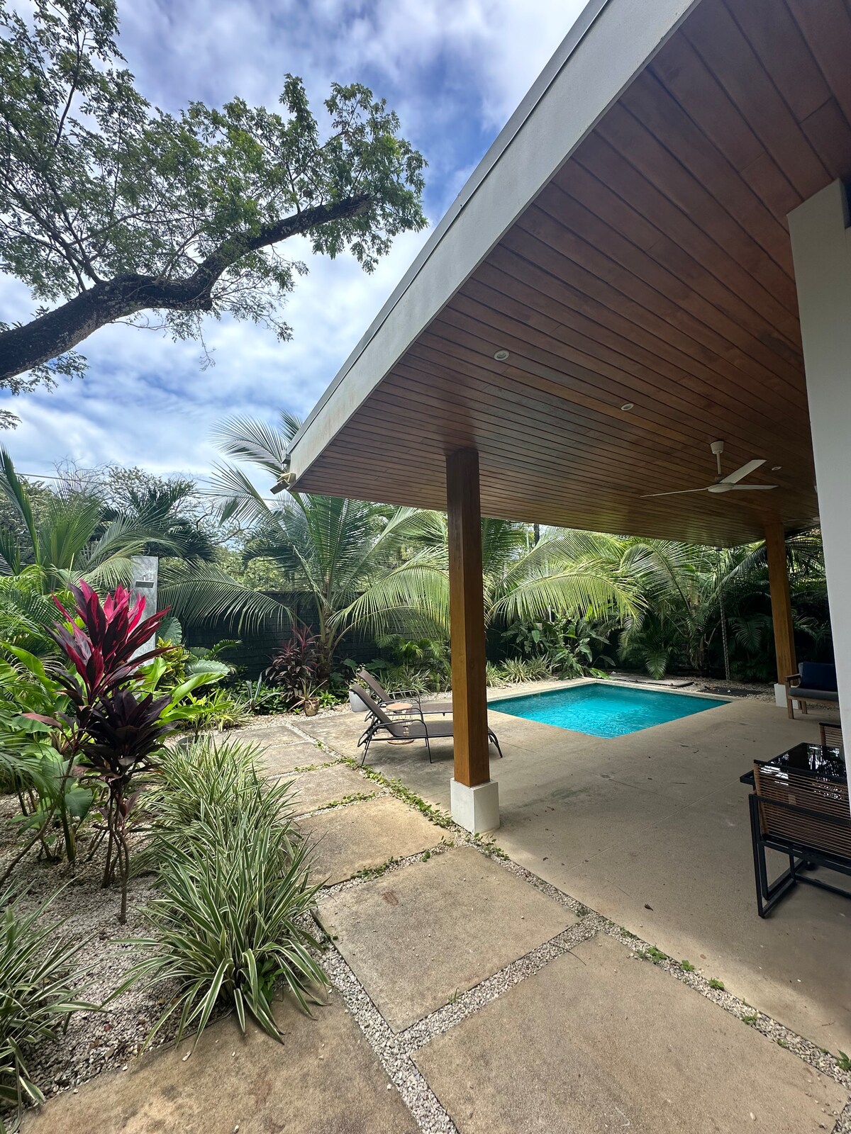 Thoughtfully designed, this elevated and high ceiling house offer all the comfort and convenience needed for both short and extended stays. - Loft bedroom with queen-size bed - Living room, sofa bed (medium) - Spacious and sunlit - Desk - Bathroom w/ rain shower - AC, ceiling fans - 100mb Wi-Fi - Safe box - Fully equipped kitchen (stove, fridge, microwave, coffee maker, more. - Covered terrace - Large sliding glass doors (w/ screens) - Laundry - Pool - Outdoor shower - Private & secure parking