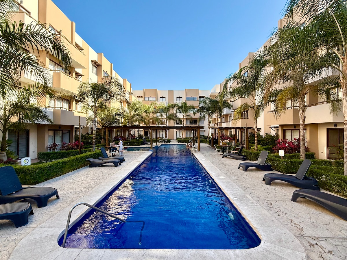 Apartmen yang serba lengkap, sesuai untuk seisi keluarga yang terletak di dalam subbahagian Palmilla Residencial satu blok dari pantai. Kawasan umum mempunyai kolam renang, barbeku, kawasan buaian rajut, permainan kanak-kanak, lubang api, golf mini, antara lain. - Ruang tamu, ruang makan, dapur lengkap, internet, TV, TV, pusat dobi, teres, teres, keselamatan 24 jam. Akses kepada semua kawasan. - Lokasi sempurna 10 minit berjalan kaki dari pantai, 8 minit dari Plaza Galleries, 5 minit dari Cerritos, 2 minit dari Marina, 10 minit dari Zon Emas dan 20 minit dari pusat bersejarah.