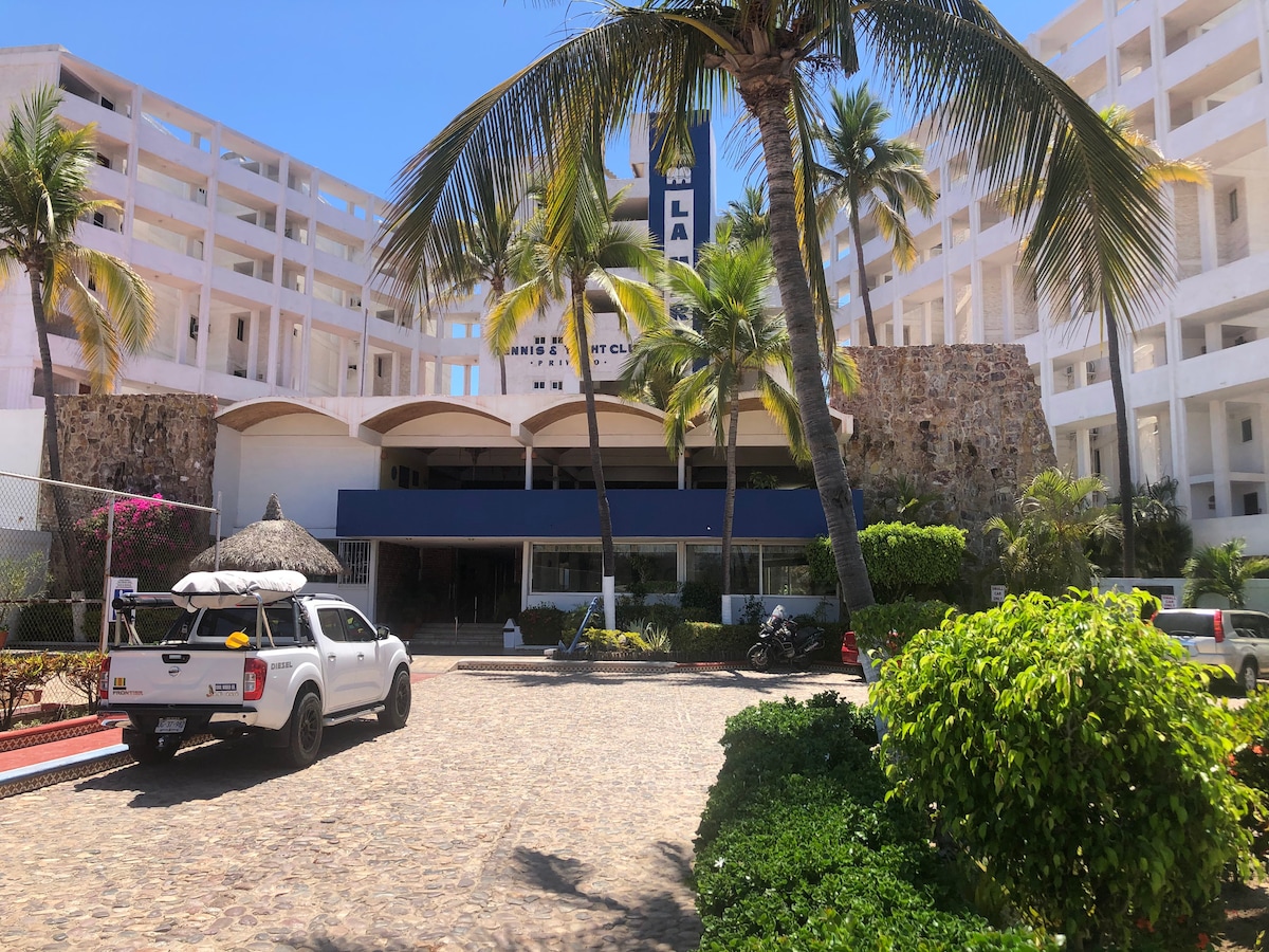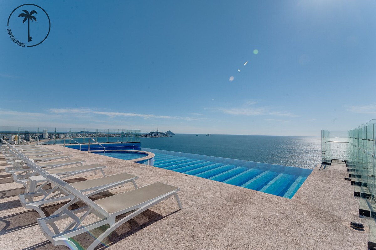 Kondominium moden di hadapan pantai dengan salah satu pemandangan yang paling menakjubkan di seluruh Mazatlan. Lengkap dengan ruang tamu terbuka, dapur, dua katil tarik keluar, dua bilik mandi penuh, WIFI, dan TV kabel Kondominium ini termasuk balkoni di mana anda boleh menikmati dan berehat hingga matahari terbenam yang cantik. Satu lagi kelebihan ialah kolam infinty, jakuzi, gimnasium dan spa semuanya percuma. Selain daripada pemandangan yang menakjubkan terdapat juga banyak restoran, pantai, tapak bersejarah, dan banyak aktiviti lain yang semuanya dalam beberapa minit.