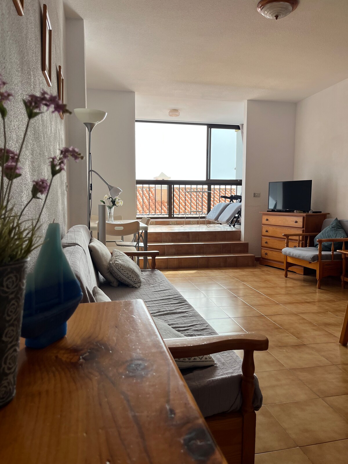Apartmen cerah, matahari sepanjang hari, TIADA PENYAMAN UDARA, satu bilik tidur, katil 180 cm dan sofa katil, bilik mandi dengan mesin basuh (TIDAK termasuk detergen), dapur dengan semua yang anda perlukan, 2 kolam renang komuniti, satu untuk kanak-kanak, beberapa minit dari pantai dan kolam semula jadi di Los Gigantes dan Alcalá dengan berjalan kaki di sepanjang tepi pantai. 30 minit dari lapangan terbang S dan 60 minit dari lapangan terbang N, berhampiran Cliffs of the Giants dan pantai Guios, 30 minit berjalan kaki dan pasar raya satu jalan dari bangunan