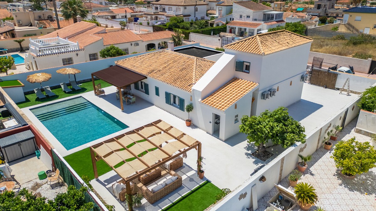 Located right in the heart of Cabo Roig, 5 mins from the famous strip is this glamorous 3 bedroom villa with stunning sun drenched sitting areas. The villa is fully equipped with a modern kitchen, 1 king size bed, 4 single beds, 2 new bathrooms, a private bedroom balcony, a stunning outdoor garden with a private large pool and a solarium. Have a glass of wine in the large garden before walking to many restaurants, bars & top shopping in this prime location.