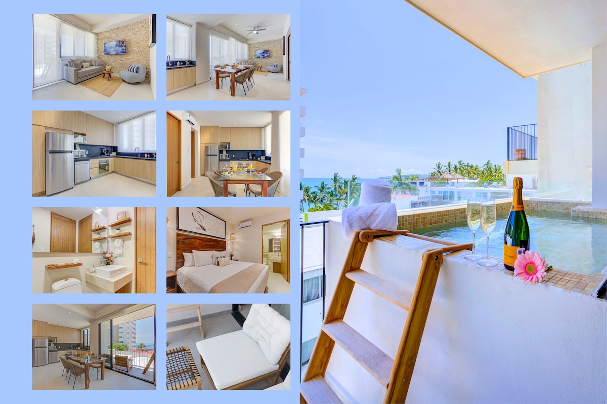 Unit sudut 1 bilik tidur ini di Zona Romántica dengan balkoni melingkar membolehkan anda menikmati kehidupan dalaman-luaran dengan pintu kaca gelongsor yang boleh ditarik sepenuhnya. Dilengkapi dengan dapur penuh, Nespresso, TV, Sonos, tirai gelap automatik dan katil saiz king, unit ini mempunyai semua yang anda perlukan untuk menikmati masa anda di PV. Kemudahan bangunan termasuk kolam renang atas bumbung, jakuzi dan gimnasium dengan pemandangan laut. Harap maklum, terdapat pembinaan besar di Zona Romántica yang boleh menyebabkan bunyi bising pada waktu siang.
