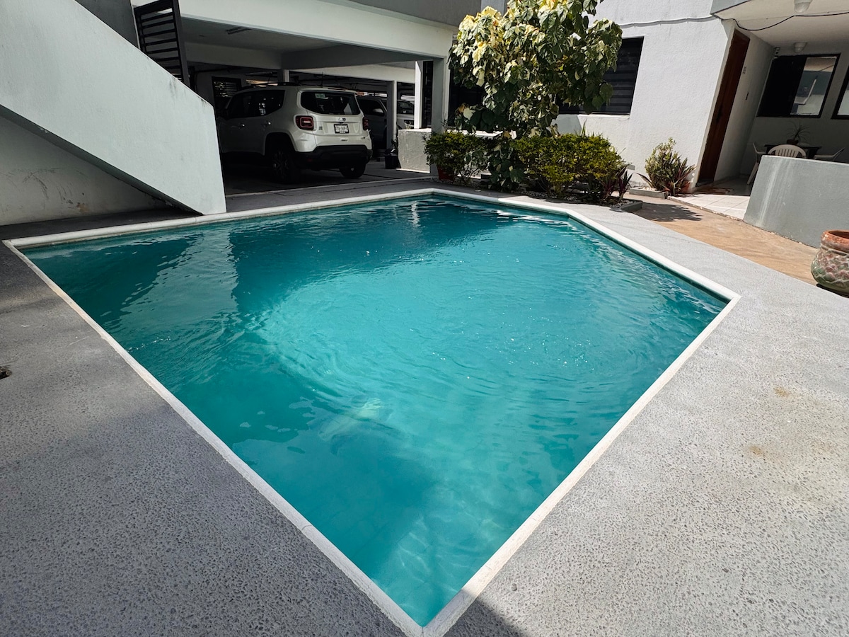 Apartmen tingkat bawah, bilik berhawa dingin dikelilingi oleh tarikan pelancong, restoran, pusat membeli-belah , muzium, 3 minit dari pantai dan 2.5 km dari Akuarium Veracruz (Satu blok dari Karnival dan maraton) -Hair dan ruang makan dengan TV pintar, dapur penuh menghadap taman pusat persendirian kecil. - Bilik tidur utama dengan katil saiz king, bilik mandi, bilik persalinan dan TV pintar. - Kamera sekunder dengan katil double dan almari. -Garage untuk kereta dengan pintu elektrik.