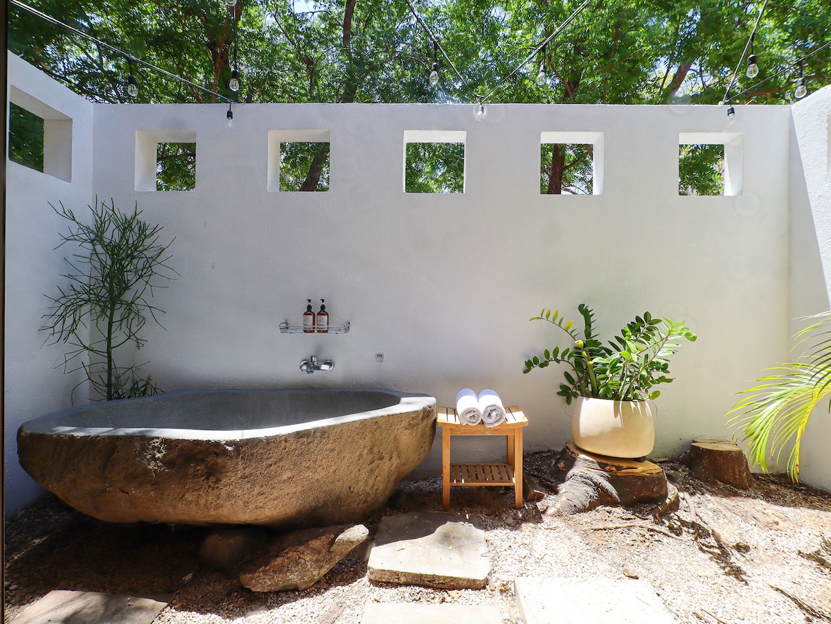 Tenggelam dalam alam semula jadi, ini adalah unit baru yang bergaya dan moden. Terperinci dengan sentuhan desa eksklusif, wain dan menjamu selera di teres yang indah sambil mendengar monyet howler. Terletak di pusat bandar, namun di kejiranan yang sejuk, anda boleh pergi 5 minit (jarak berjalan kaki) dari pantai Tamarindo yang bersih. 2BR / 2BA, AC, dapur lengkap, teres, pengalaman makan atas pokok luar, tempat letak kereta percuma di premis. Bertenang di percutian yang unik dan tenang ini.