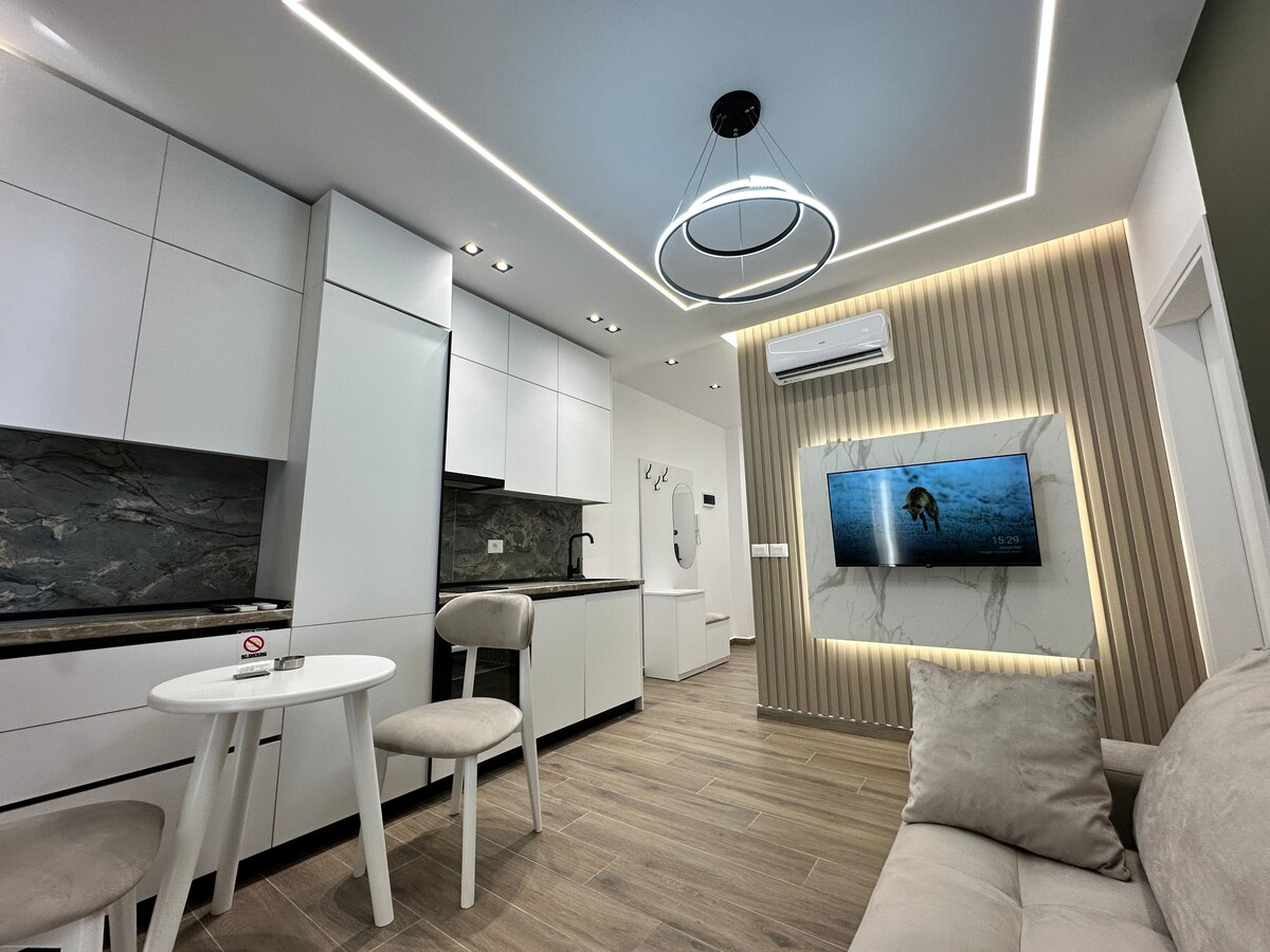 Terokai apartmen satu bilik tidur baharu kami di Shkëmbi i Kavajës, Durres, betul-betul di pinggir laut. Nikmati pemandangan Laut Adriatik yang menakjubkan dan akses pantai terus hanya beberapa langkah jauhnya. Sesuai untuk pasangan atau keluarga, ia menampilkan bilik tidur moden, ruang tamu yang selesa dengan dapur kecil, dan bilik mandi yang anggun. Bersantai di balkoni persendirian atau terokai kafe dan tarikan berhampiran. Alami kehidupan pantai yang terbaik di lokasi yang tenang ini.