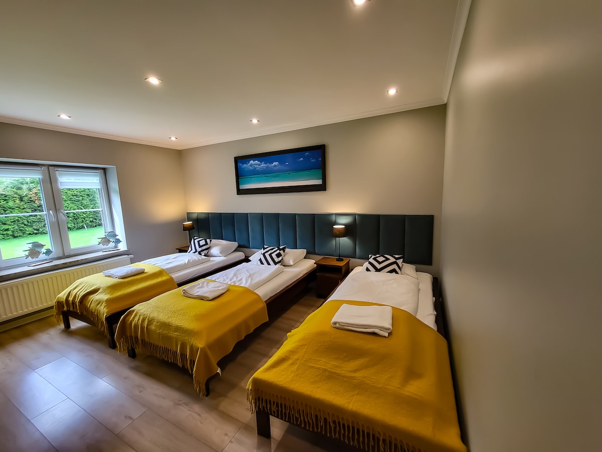 Pemandangan air terus: Flat gaya retro yang selesa dengan balkoni besar, 600m dari pantai dan pusat bandar. Cadar, tuala dan pembersihan akhir termasuk dalam harga keseluruhan. Sesuai untuk keluarga. Kolam renang dalaman dan sauna di dalam rumah. Termasuk dua basikal trekking secara percuma Cukai pelancong sebanyak 3 PLN bagi setiap tetamu semalam dibayar di lokasi.