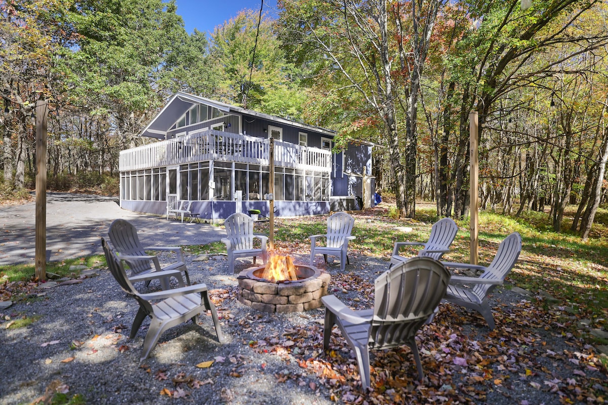 Chalet yang menakjubkan terletak di pergunungan Pocono. Destinasi anda untuk percutian hujung minggu atau penginapan yang lebih panjang sepanjang tahun! Di luar seseorang boleh menikmati suasana semula jadi di penginapan hutan persendirian seluas 1 ekar yang indah, tab mandi air panas, dua lubang api, dek untuk kopi pagi, atau BBQ yang lazat. Rumah kami menawarkan suasana dalaman yang tenang dan rumah terletak berhampiran semua aktiviti bermusim Pocono Mountains. Sama ada anda ingin berehat atau memulihkan tenaga, kediaman kami menyediakan percutian yang sempurna.