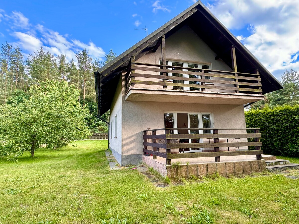Uroczy drewniany domek wypoczynkowy z tarasem i dużą ogrodzoną przestrzenią na wyłączność. Blisko do plaży i z dala od zgiełku - idealny dla rodzin i zorganizowanych grup. Jesteśmy psiolubni :) - Lovely pine cabin with tarrace and a spacious fenced garden situated close to the beach and away from the hustle and bustle - perfect for families and organised groups.