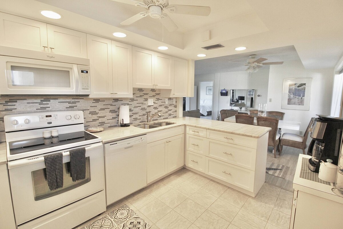 Bersantai di ruang yang tenang dan bergaya ini. Diubahsuai sepenuhnya, semuanya baru! Anda akan ada semua yang anda perlukan di sini, termasuk kereta golf. Pantai yang indah, kolam renang komuniti yang besar, bilik permainan, dan banyak perkara yang boleh dilakukan di pulau ini dan di pusat bandar berhampiran. Lokasi ini adalah yang terbaik di Pantai Jensen. Lihat buku panduan kami untuk pelbagai tarikan tempatan, idea rekreasi luar, tempat makan, membeli-belah dan hiburan. Mari nikmati ruang kami yang bersih dan tenang. Kami sedia membantu jika anda memerlukan apa-apa.
