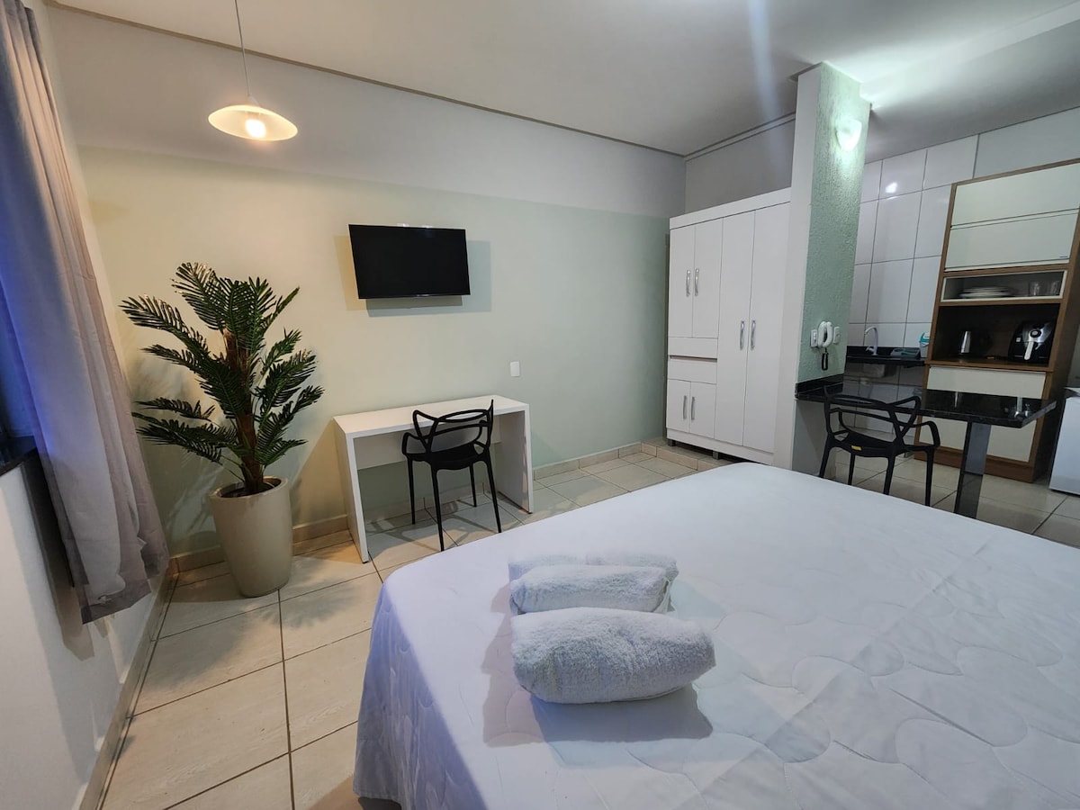 Sama-sama! Apartmen studio yang selesa dan praktikal terletak di sudut Praça do Cristo, di tengah-tengah bandar. Dekat dengan taman pameran, bank, farmasi, pasar raya, stesen minyak, bar makanan ringan, dobi, stesen bas, kedai roti dalam radius kira-kira 500 meter. Di sini, anda akan mempunyai semua yang anda perlukan untuk penginapan yang selesa, berfungsi dan strategik.