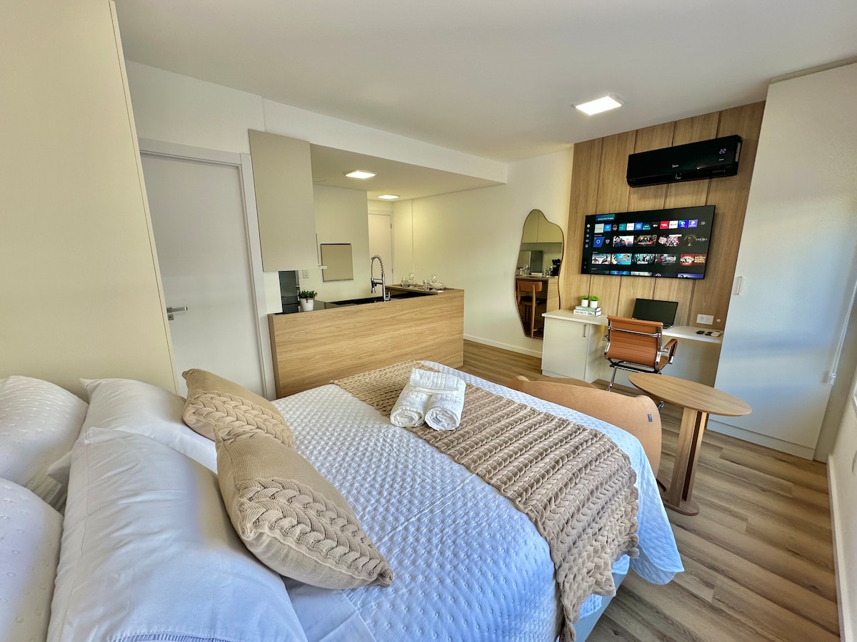 Studio baharu 43 meter persegi di TREND CITY, pemandangan panorama menakjubkan (tingkat 16) ke Tasik Guaíba, Lake Shore dan Taman Marinha, kondominium dengan infrastruktur lengkap, penjaga pintu 24 jam, ruang letak kereta, gimnasium, kolam renang panas 20m. Katil bersaiz queen, ruang untuk bekerja dengan komputer riba, penyaman udara panas dan sejuk 24,000, Smart TV 50, TV kabel NET HD dengan 250 saluran, Wi-Fi 250 mbps, lubang barbeku, mesin basuh dan pengering, seterika, pengering rambut, ketuhar gelombang mikro, airfryer, tag dan kunci elektronik.