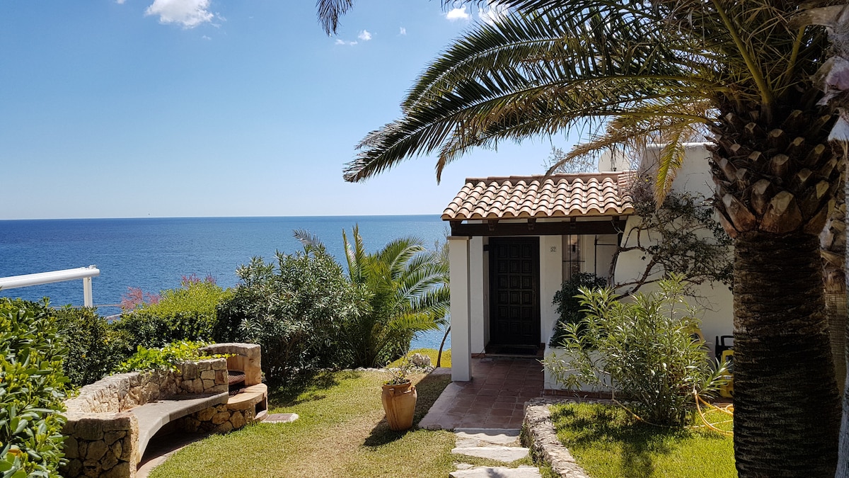 oceanfront House in 1. Meereslinie das im ibizkenischem Stil erbaute weisse Ferienhaus befindet direkt oberhalb des Meeres mit 180 Grad Blick über das azurblaue Mittelmeer , Natursteinboden und Fussbodenheizung ca 3 min zu Fuss vom wunderschönen Strand Cala Anguilla mit weissem Sand und kristallklaren Wasser das auf dem Grundstueck befindliche guest house kann dazu gemietet werden (es wird nicht einzeln vermietet) (offener Wohn-Essbereich, Schlafzimmer, Bad, Terrasse)