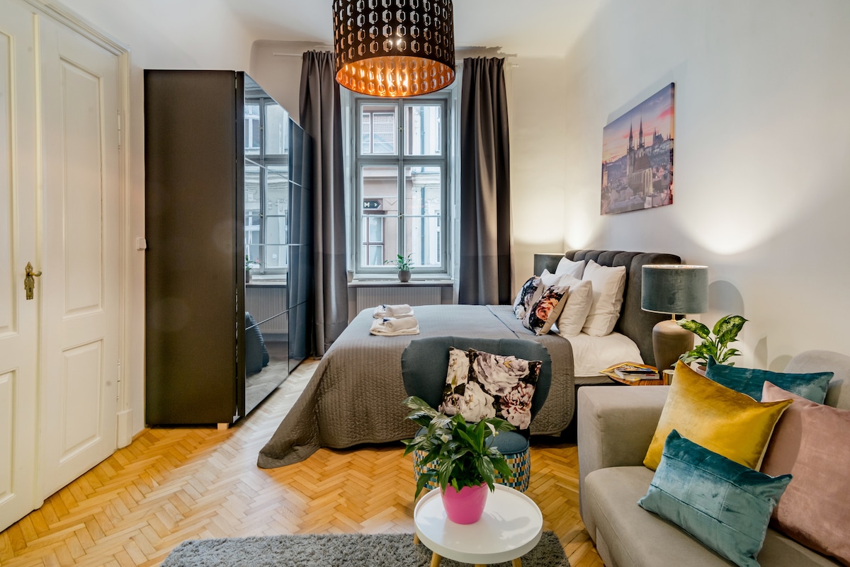 Apartmen yang baru diubahsuai & dihiasi dengan cantik bersebelahan dengan DATARAN BANDAR LAMA dengan tangga Renaissance dan banyak unsur sejarah yang indah tawaran apartmen: WIFI berkelajuan tinggi percuma, dapur lengkap dengan mesin basuh pinggan mangkuk, TV dengan saluran antarabangsa, tingkap kalis bunyi, tilam berkualiti untuk tidur selesa anda, penyaman udara pusat dan dalaman moden baru yang digabungkan dengan lantai kayu lama yang dipelihara dengan indah. Selesa menempatkan hingga 4 tetamu dengan selesa.