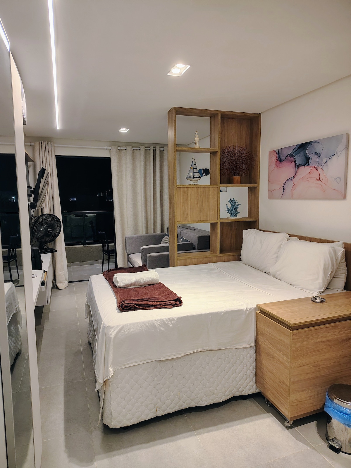 Studio no Marulhos Suites Resort. Cama queen, bicama, colchão extra, ar condicionado, internet boa e smart tv. A cozinha conta com geladeira, Gelágua, cafeteira, sanduicheira e os demais utensílios de cozinha. Apto aconchegante de frente para as piscinas. O hotel é de primeira, conta com várias piscinas, sauna, academia, campos de futebol e tênis, área de jogos e recreação todos os dias para a criançada. Ja tenho alguns anos alugando esse e outros flats em muro alto, então pode confiar!