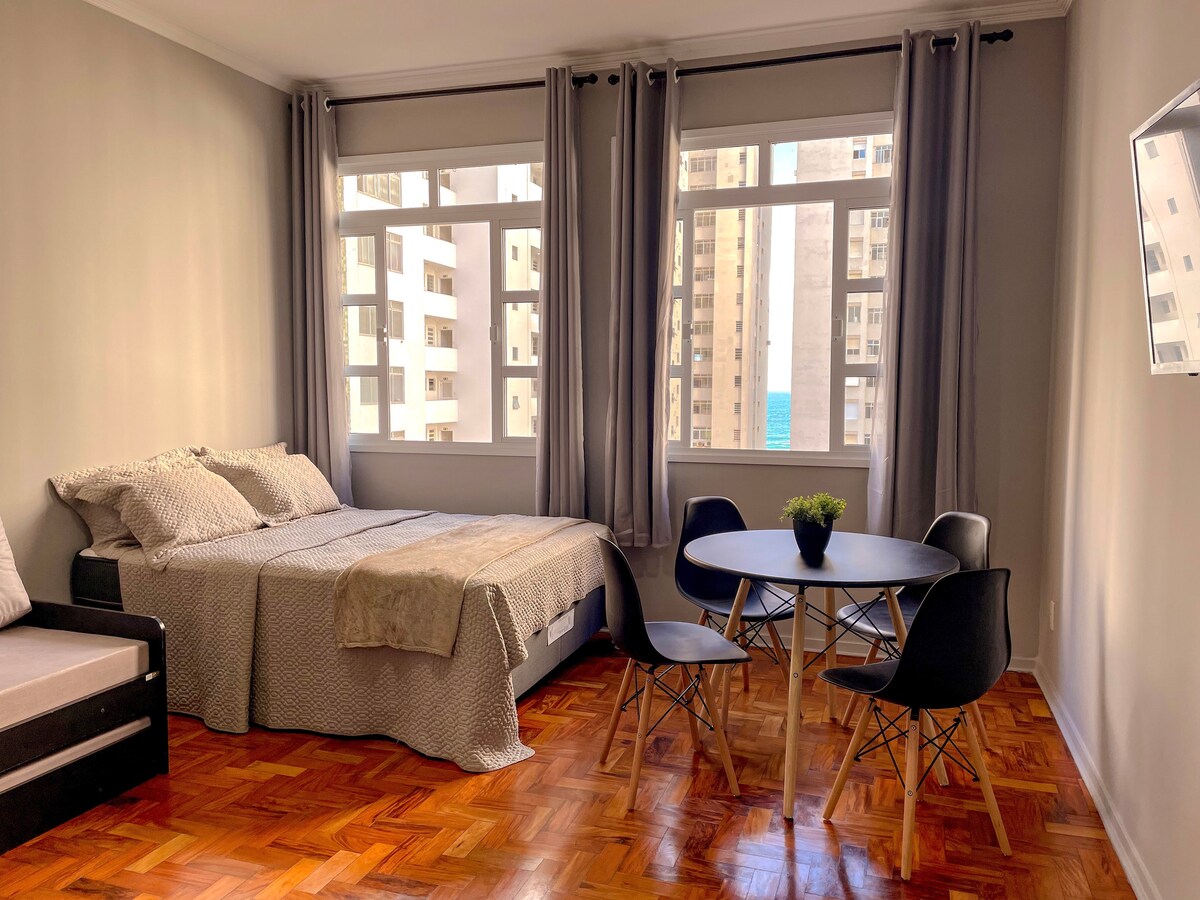 Studio compacto e aconchegante, localizado no centro do Guarujá, a 45 metros da praia de Pitangueiras. Completamente reformado, o Studio possui cama box casal, sofá cama para 2 pessoas, SmartTV c/ Netflix e Wifi fibra óptica. A cozinha é equipada com utensílios básicos. Banheiro espaçoso com chuveiro elétrico. Não há ar condicionado, porém o Studio é arejado e possui ventilador de teto. Fechadura eletrônica para maior conforto e segurança. Portaria 24hr.