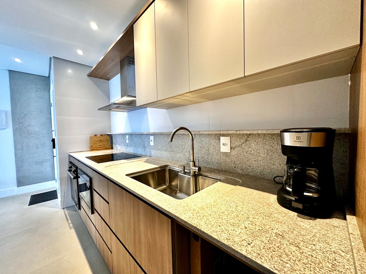 Percutian mewah✨ anda di Jurerê Internacional sedia untuk mengalu-alukan anda! Apartmen eksklusif ini, yang menampilkan hiasan canggih baharu, menawarkan keselesaan dan keanggunan di salah satu lokasi yang paling istimewa di Florianópolis. Menginap di tengah-tengah kejiranan yang paling menawan di bandar ini, betul-betul bersebelahan dengan Open Shopping, dikelilingi kafe, restoran dan laluan basikal. Yang paling baik, pantai hanya 10 minit berjalan kaki (800m) melalui jalan-jalan yang dipenuhi pokok, menjadikan setiap saat benar-benar istimewa.