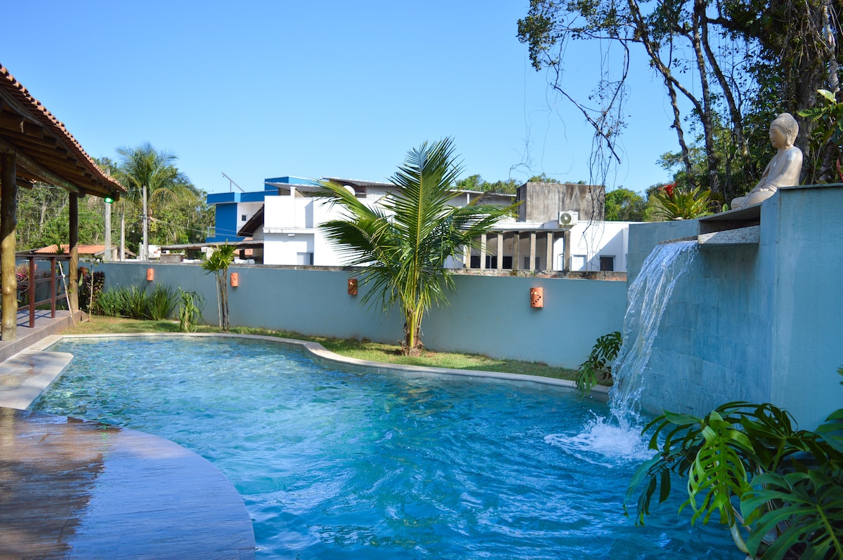Rumah yang luas dengan kolam renang persendirian yang menampilkan hidromasaj dan pencahayaan LED. Termasuk 3 suite dengan balkoni (2 dengan pemandangan kolam renang dan Hutan Atlantik asli), bilik TV, dapur terbuka, bilik mandi penuh, Wi-Fi berkelajuan tinggi, dapur luar, barbeku dan ketuhar pizza. Kawasan luar yang tertutup dengan meja besar dan pendiangan. Terletak di komuniti berpagar dengan keselamatan 24 jam. Kira-kira 10 minit berjalan kaki ke pantai dan 25 minit ke Barra do Rio Itaguaré. Mesra haiwan peliharaan