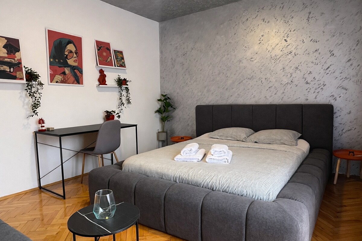 Selamat datang ke studio moden kami yang selesa di tengah-tengah bandar! Direka dengan😊 teliti dengan hiasan dalaman yang bergaya, nada hangat, dan percikan warna, ruang ini sesuai untuk berehat selepas seharian di luar. Terletak di kejiranan pusat bandar, anda hanya beberapa langkah dari kafe, restoran dan tempat popular tempatan. Sama ada anda berada di sini untuk bekerja atau bersantai, nikmati Wi-Fi yang pantas, dapur yang serba lengkap, dan ruang tamu yang cerah dengan balkoni. Penginapan bandar sempurna anda menanti.