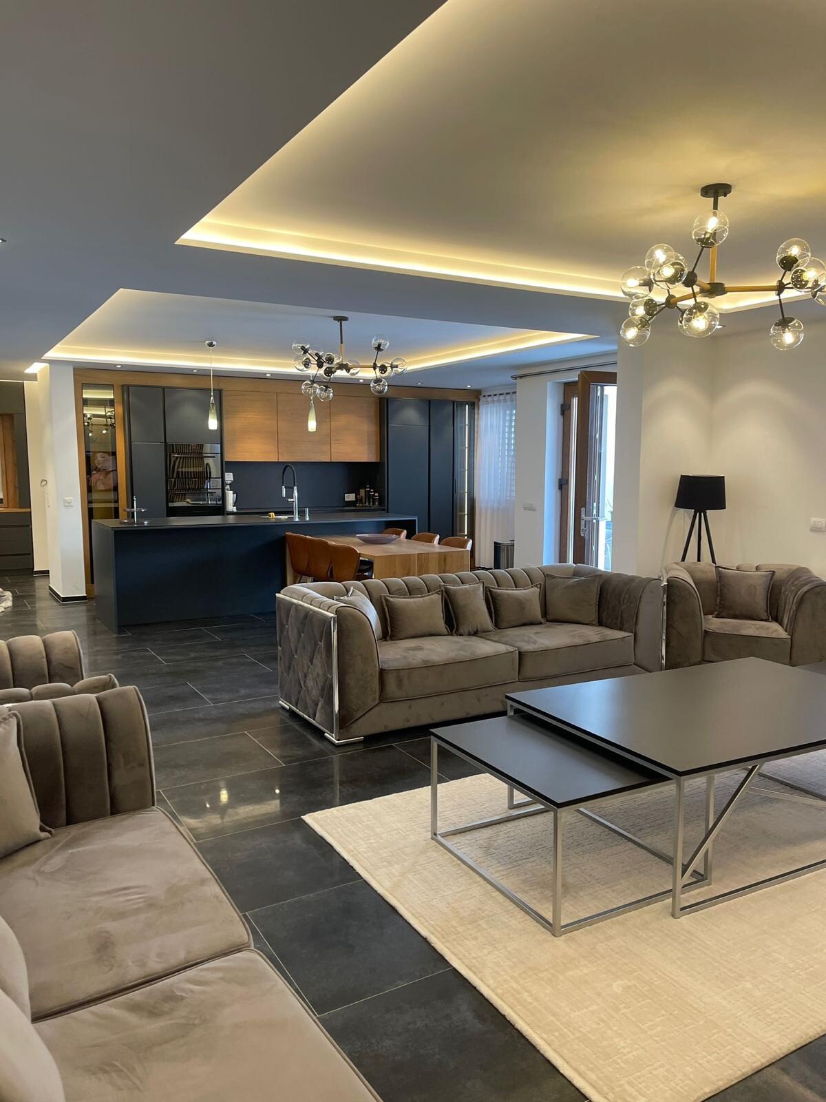 Located in the very heart of Prishtina, directly in the main city square, this apartment sits in a fully walkable, pedestrian-only area with no car traffic. Cafés, restaurants, bookstores, and cultural spots are all just steps away. As expected for such a central and vibrant location, the surroundings are lively, especially during the day and evening. The apartment features a smartly designed kitchen that can transform into a living area, with deep, rich tones creating a warm urban atmosphere.