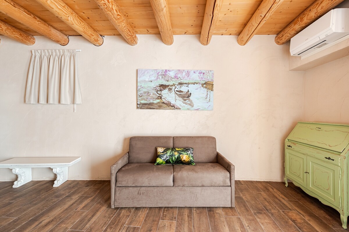 L'appartamento "Accanto al giardino" si sviluppa al piano terreno con ingresso, soggiorno (divano letto), angolo pranzo, spazio cucina e, al piano seminterrato, con camera letto/studio (camino funzionante) e bagno/lavanderia. E' molto luminoso, affacciandosi su una piazza rivolta a sudovest che confina con la verdeggiante piazza Pallone, antico ingresso a Corte contornato da tigli e bosso. Per il tempo libero sono a disposizione libri, guide locali, qualche gioco e il televisore.