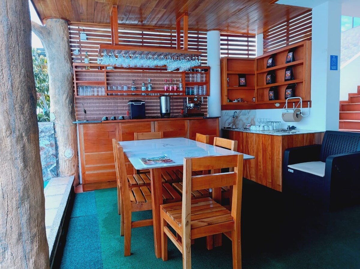 Terletak di teres salah satu bangunan tertinggi di pulau ini, anda akan menikmati pemandangan yang indah sepanjang hari. Sangat mudah dicari, di jalan utama Baltra. Dikelilingi restoran, kedai dan ATM Banco Pichincha di seberang jalan. 4 blok dari Terminal Terrestre dan 3 blok dari Mercado Municipal dan perhentian bas ke kawasan luar bandar. Privasi di teres terbuka anda sendiri yang dilengkapi dengan peralatan senaman, ruang makan dan dapur dengan peralatan makan. Sesuai untuk mesyuarat.