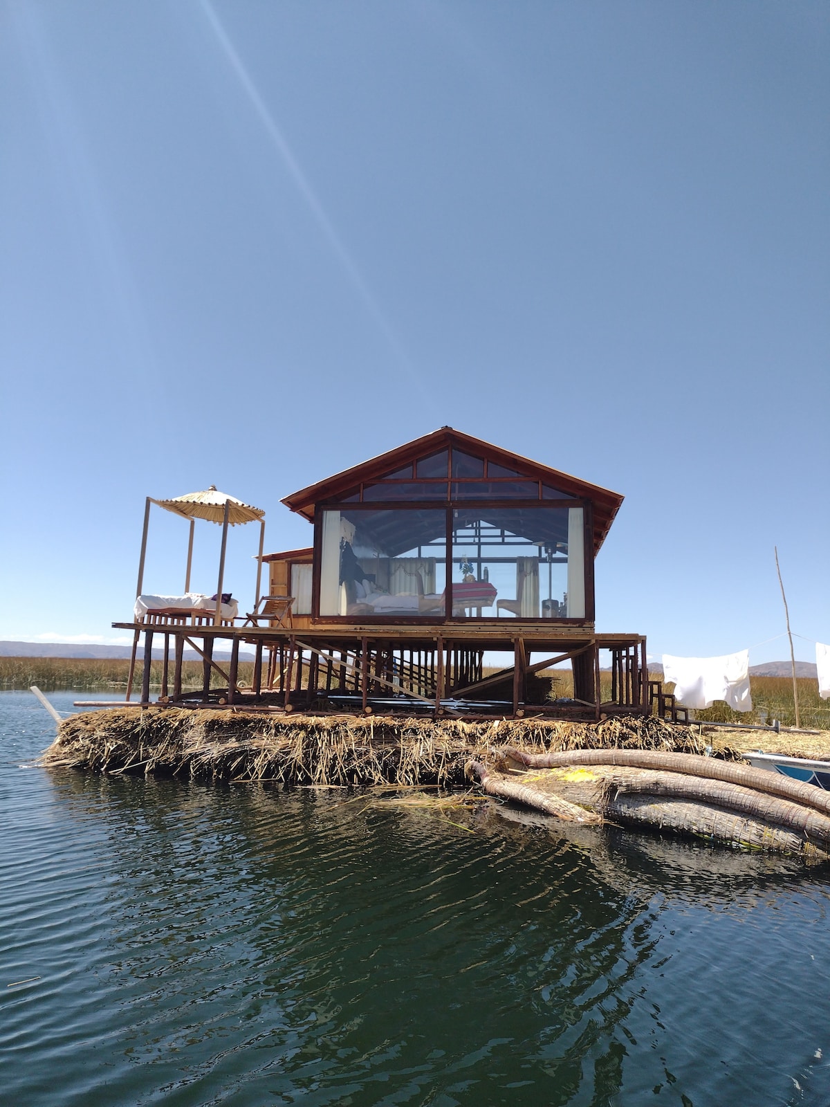 Son cabañas suites el lugar es único y exclusivo el paisaje que lo rodea es asombroso la vista desde la cabaña es mágico los atardeceres, la isla es privada alrededor se puede observar la fauna, mucha paz y tranquilidad la cabaña cuenta con todos los servicios A1. Ven y vive la experiencia de estar en una isla flotante en medio de lago Titicaca
