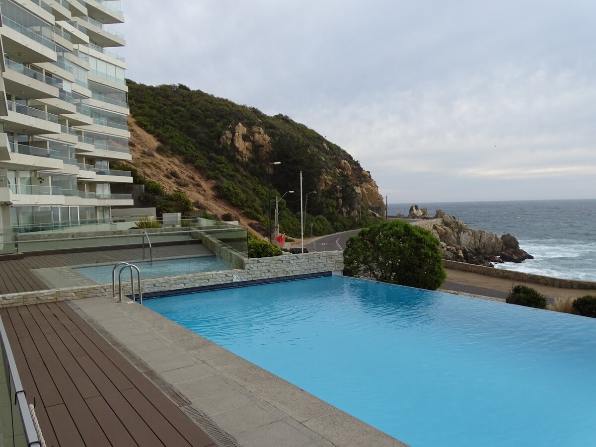 Apartmen yang cantik dan moden di tepi laut, pemandangan laut yang menakjubkan dan istimewa untuk dinikmati dan berehat sebagai pasangan atau keluarga. Kolam renang luar. Jakuzi, gril barbeku, gimnasium dengan kos tambahan. Tempat letak kereta persendirian untuk 1 kereta. Dilengkapi untuk 6 orang. Terdapat caj tambahan untuk lebih daripada 4 tetamu. Dobi dengan bayaran tambahan. 5 minit dengan kereta dari pantai Reñaca, 15 minit dari Viña del Mar. 5 minit dari restoran dan pasar raya hebat di Concón.
