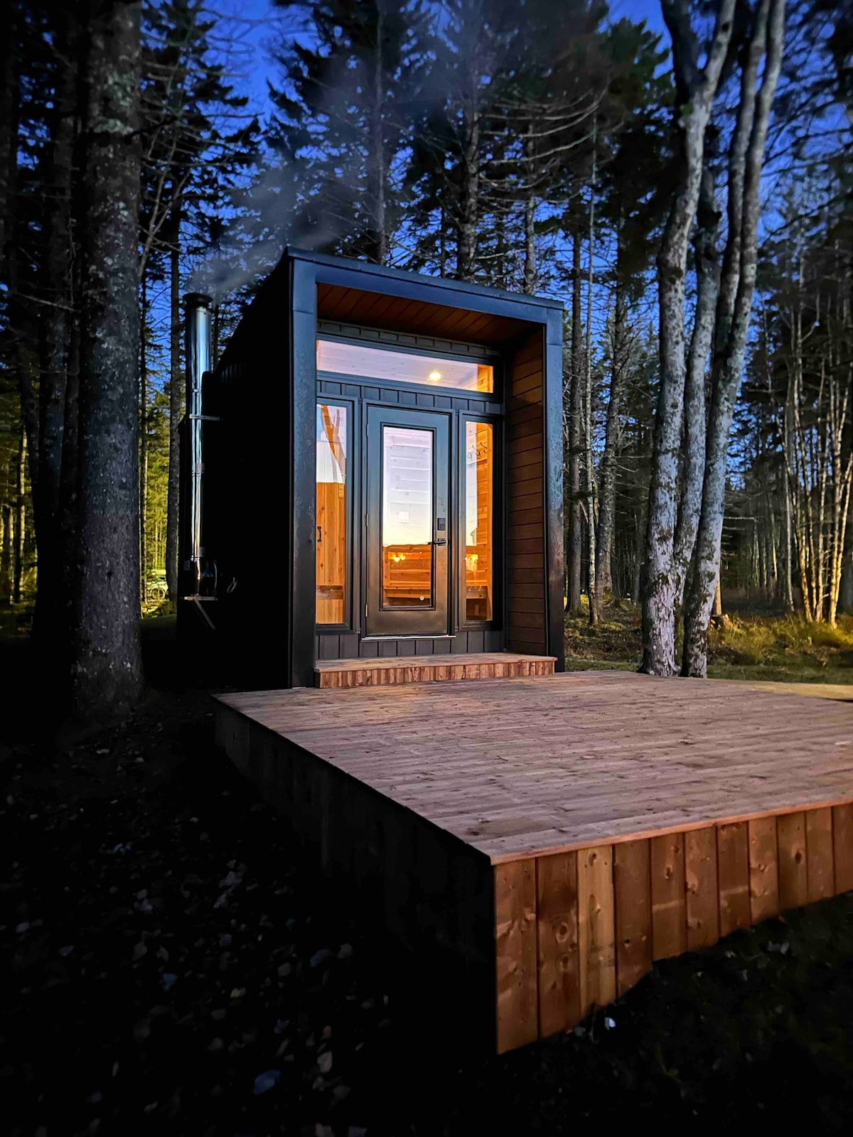 We would like to share this piece of our paradise with you, located on a peaceful, crystal clear lake. Acres of land, a sandy beach hidden behind a well-groomed property sprinkled with beautiful tall trees disappearing into the Acadian forest. Includes: private hot tub and firepit, shared sauna, cold plunge, lake access, public wood fired hot tub (great for groups when booking one than more cabin) canoe, kayaks, paddle boards, pedal boat, sandy beach, floating mat and more.