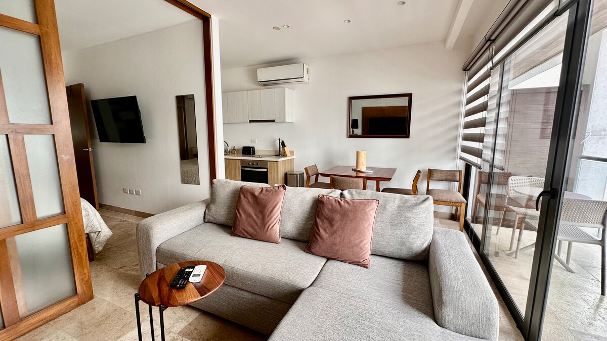 Welcome to this meticulously designed studio in vibrant Tulum Centro. Perfect for solo travelers or couples, it blends comfort, style, and convenience. Featuring a king-size bed, smart TV, a fully equipped kitchen, and a private balcony with garden views. Enjoy the rooftop pool, paddle tennis court, and access to vibrant art installations. Your reservation includes complimentary concierge service, and direct reservations for some of the best beach clubs.