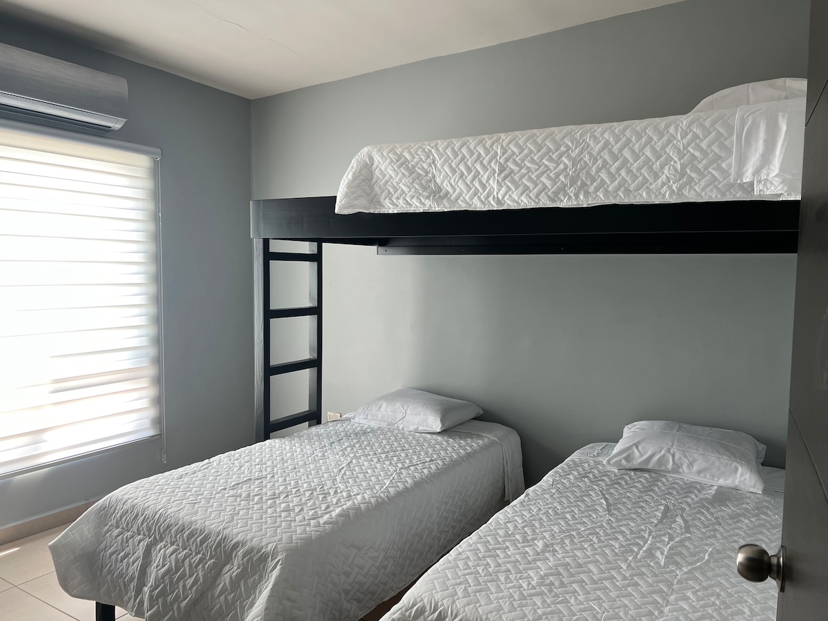 🌟 Nikmati Saltillo 🏠 Rumah moden dengan 2 bilik tidur, masing-masing dengan bilik mandi penuh dan A/C ✈️ 5 minit dari Lapangan Terbang Saltillo 🍳 - Dapur yang disediakan 📶 Wifi berkelajuan tinggi 🚗 Garaj berbumbung dengan pintu elektrik + tempat eksklusif tambahan 📍 Berhampiran dengan 🛒 Costco, plaza, 🍽️ restoran dan 1 km dari lebuh raya ke Monterrey ✨ Sesuai untuk berehat, bekerja atau meluangkan masa bersama keluarga 🧾 KAMI bil! Tempah sekarang!!