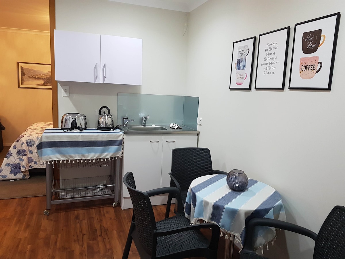 Saya dan suami mengalu-alukan anda ke Feilding yang mesra. Tempat tidur kami mempunyai bilik mandi (pancuran mandi, meja solek, tandas), TV, almari pakaian dan katil queen dengan linen dan tuala. Terdapat jag dengan cawan, teh/kopi/susu dan peti sejuk. Tiada kemudahan memasak. Tempat tidur di luar berasingan daripada rumah supaya anda boleh datang dan pergi sesuka hati anda. Daftar masuk/keluar sendiri yang mudah. Ibu saya adalah hos bersama jadi ia benar-benar dikendalikan oleh keluarga. NB: sarapan tidak termasuk dan disebabkan bekerja sepenuh masa, daftar masuk adalah dari 5 petang. Terima kasih :)