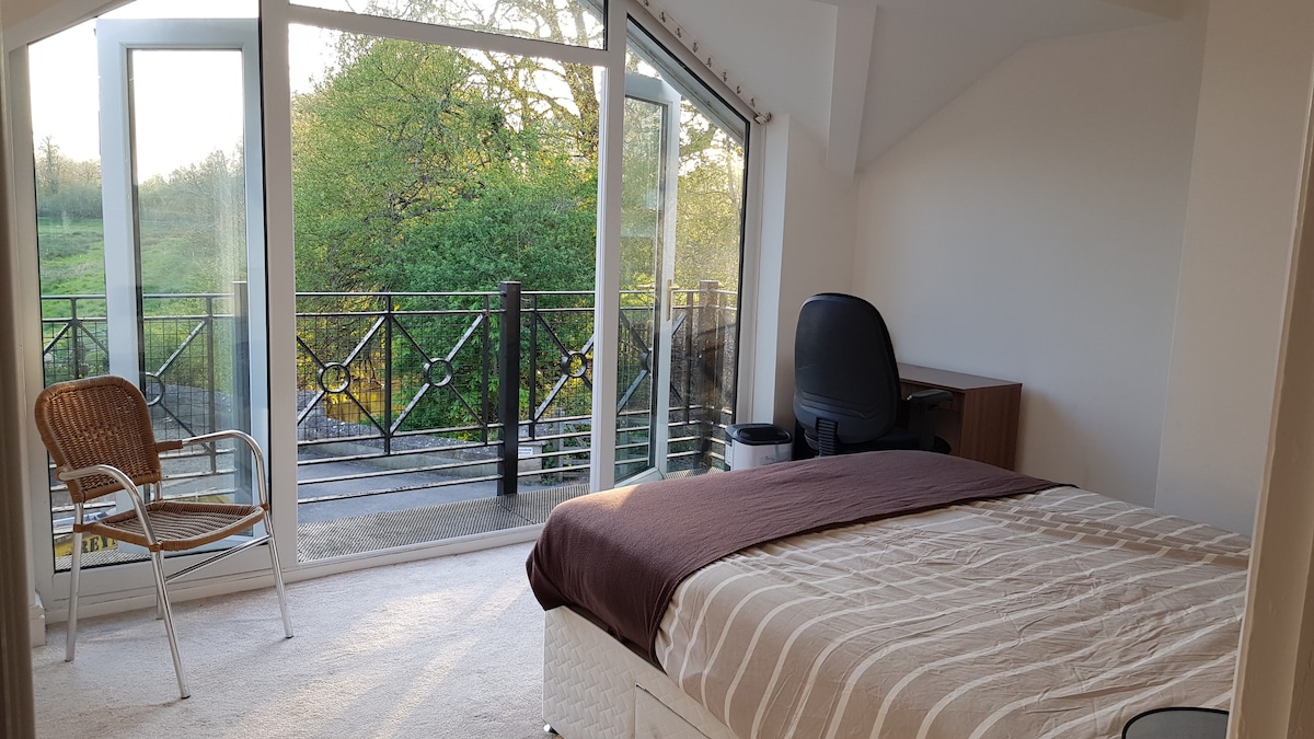 Akses persendirian, pintu hadapan menuju ke ruang tamu dan pintu patio ke taman. Berperabot lengkap, katil sofa, meja, teh, kemudahan membuat kopi, ketuhar gelombang mikro, seterika dan Wi-Fi percuma. Tingkat atas, bilik pancuran mandi ensuite, katil kelamin, peti laci, almari pakaian dan TV. Pintu ke dapur rumah utama menghubungkan lampiran dan kekal terkunci. Kami menghormati privasi tetamu kami tetapi tersedia jika perlu. Berjalan kaki sebentar dari stesen bandar/kereta api dan pasar raya, restoran dan pub yang terletak berhampiran.