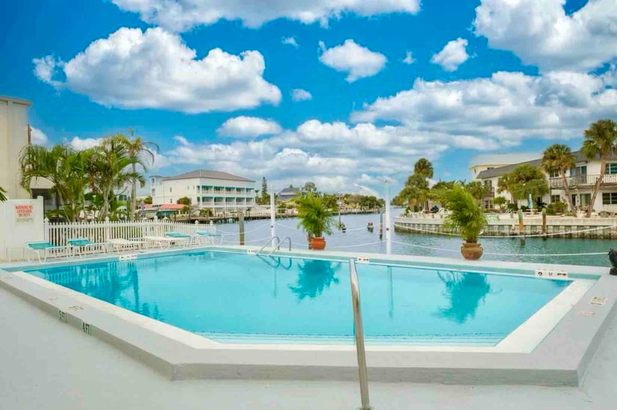 Harap maklum bahawa gimnasium, jakuzi dan tab mandi air panas ditutup buat sementara waktu (kerosakan akibat taufan) Dirombak sepenuhnya, tema pantai dihiasi, kondominium tingkat dua berperabot cantik hanya beberapa langkah dari pantai berpasir sutera putih! Sesuai untuk percutian romantik, percutian bulan madu, dan percutian! Terletak di Madeira Beach Yacht Club, komuniti berpagar persendirian, tempat letak kereta percuma, WI-FI berkelajuan tinggi, kabel TV, Netflix, 2 kolam renang luar yang dipanaskan, dan jeti memancing. Sila tempah sekurang-kurangnya 7 hari sebelum ketibaan anda