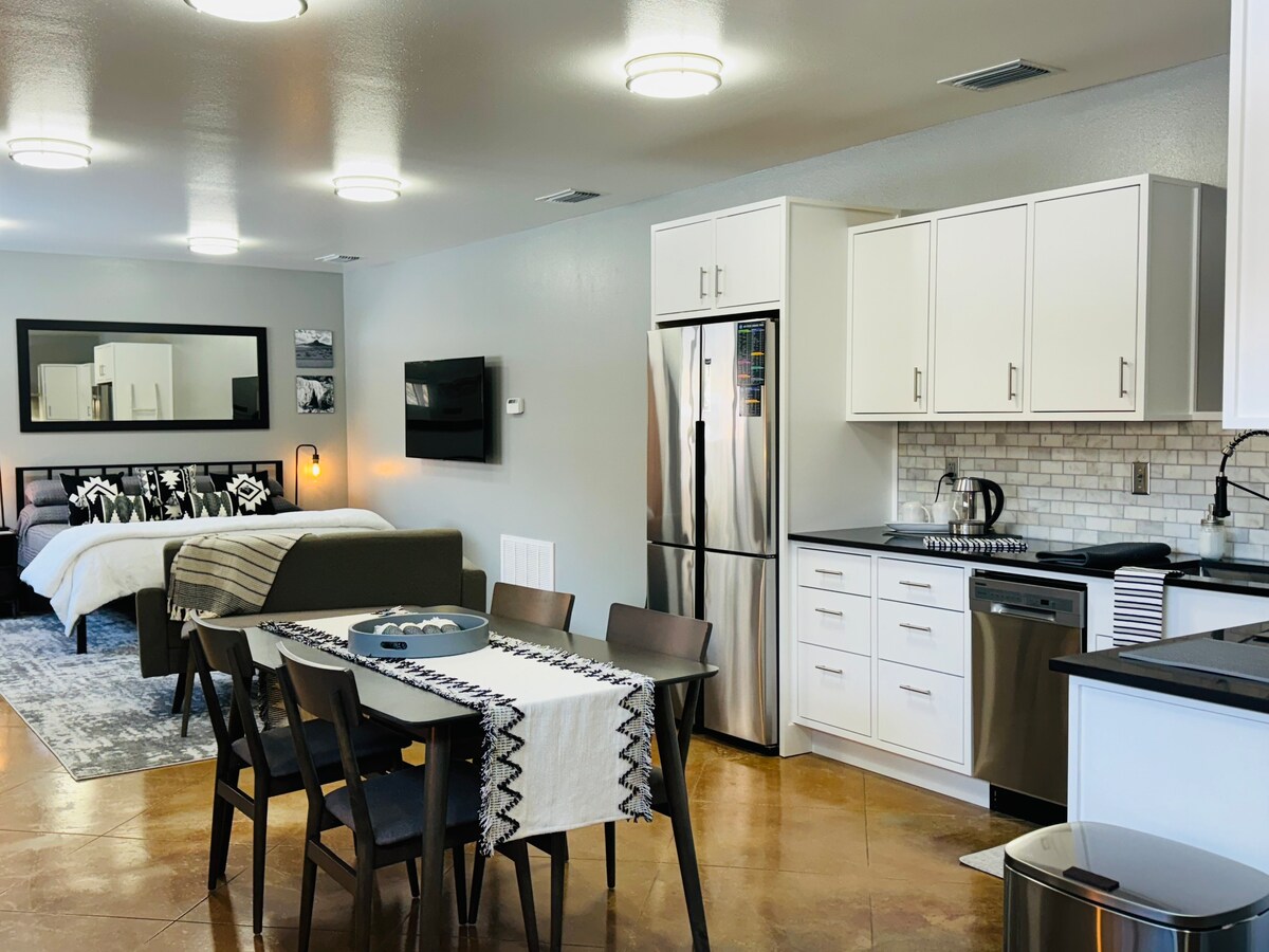 Full luxury. Breathtaking natural beauty. 1,475 sq ft Casita, with views of Abiquiu Lake, the red cliffs surrounding Ghost Ranch, and the 10,000 ft mountain Pedernal, all which Georgia O'Keefe made famous in her paintings. The kitchen has stainless steel appliances and a Bosch gas stove with heavy gauge grills. There's a stainless BBQ just outside on the portal. The Master BR has a slate shower and deep soaking tub. Both bedrooms have Queen beds, + a Full Size Inflatable Mattress available.